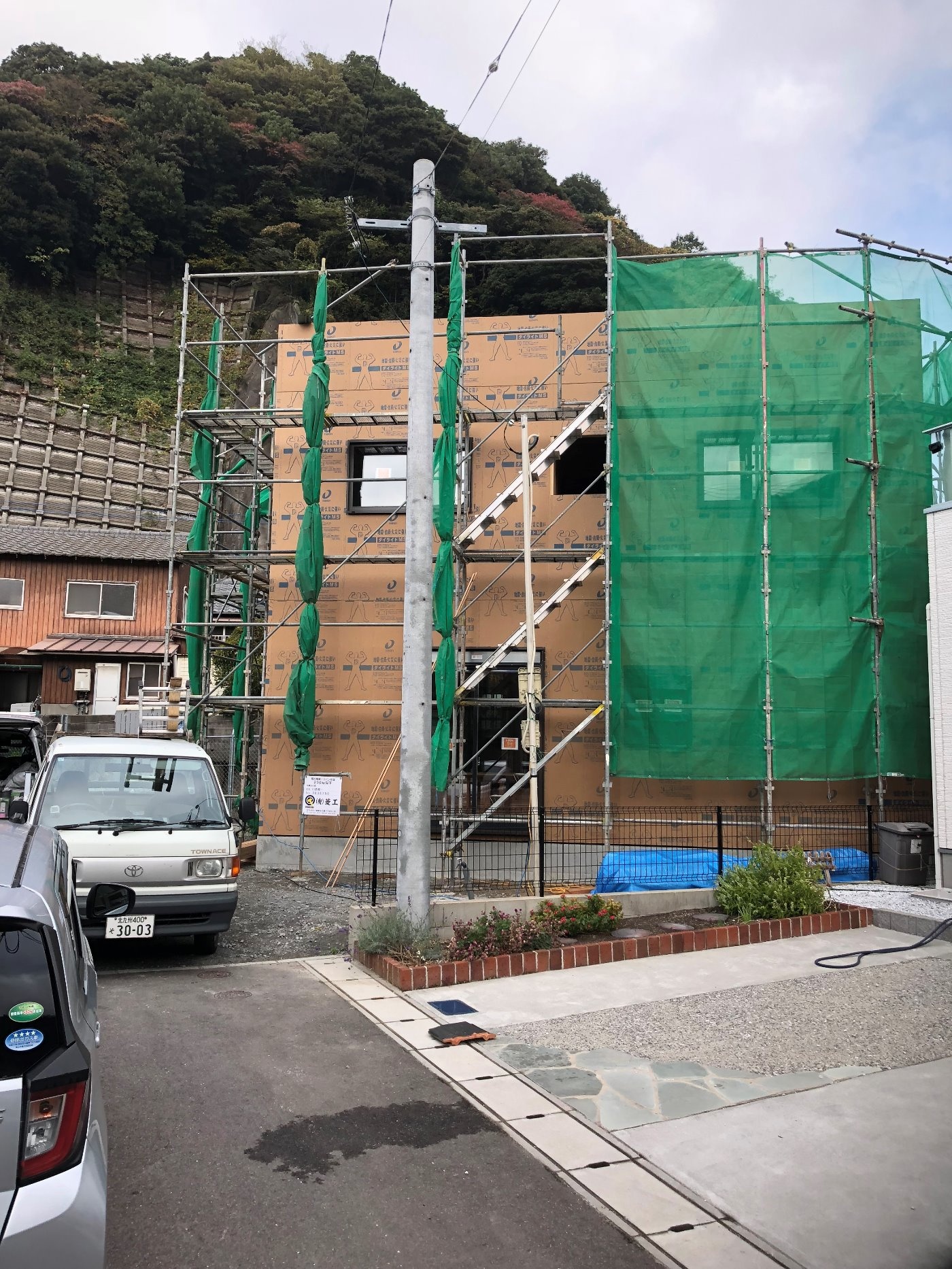 前回、紹介した棟上げ後の新築現場はといいますと、、、現在、外装工事中です!!