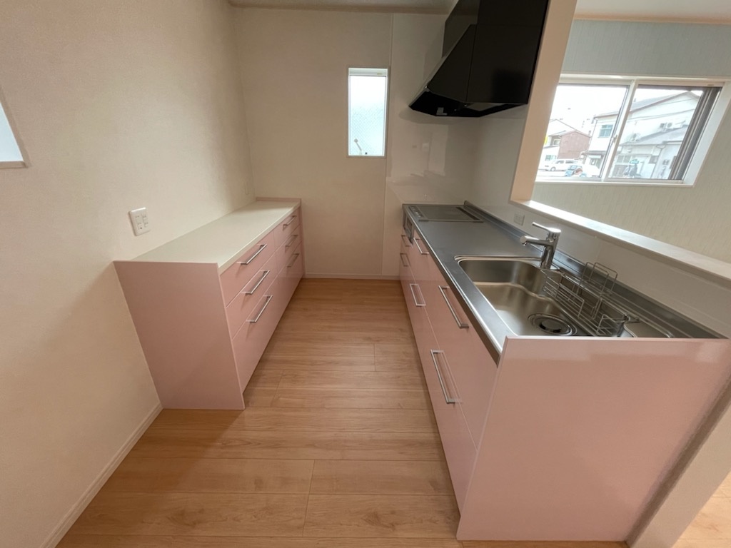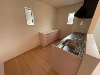 フローリングの明るい木目にピンクのキッチンがアクセントになって