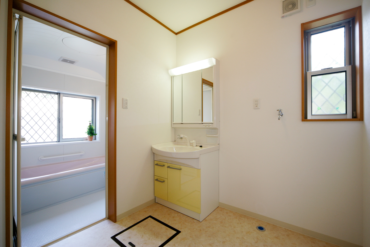 コンパクトながらも収納力のある洗面化粧台と、水に強いクッションフロアを採用。