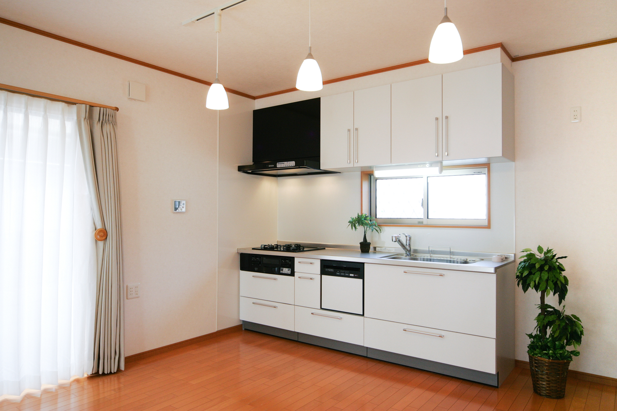 空間を自由にアレンジできるように、キッチンは対面式ではなく、あえて壁側に配置しました。