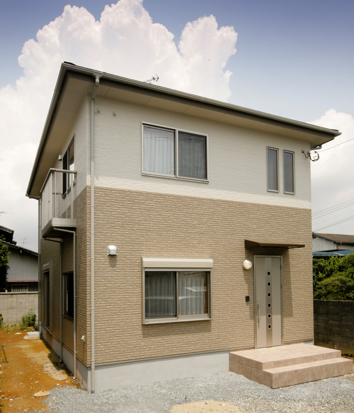 優しい印象の外壁とプラチナステンの色味の玄関ドアを調和させた、あたたかでモダンな外観です。