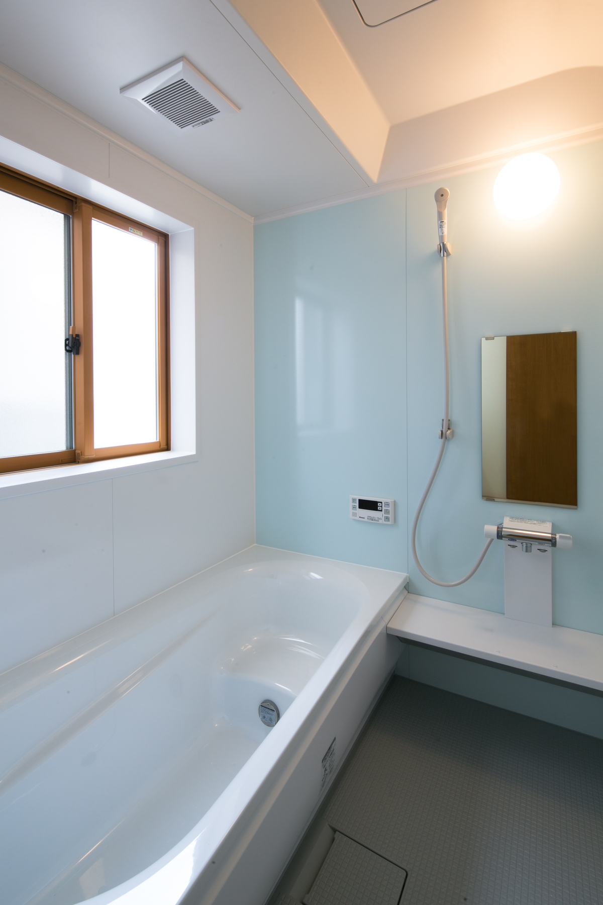 プリエアクアのアクセントパネルが爽やかな印象のシステムバスは、TOTOのサザナです。