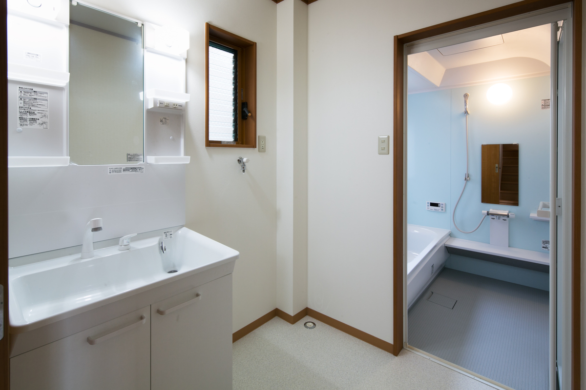 間口750mmの洗面化粧台と洗濯機を並べて置けるゆとりのある洗面脱衣室。