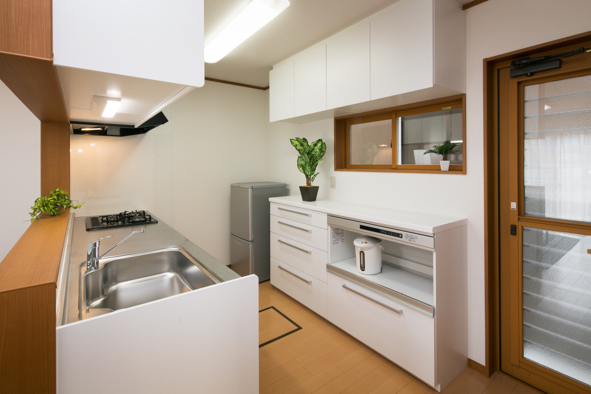 TOTOのCJを採用。ユニホワイトの明るいキッチンは、オプションの壁面収納も仕様を合わせました。