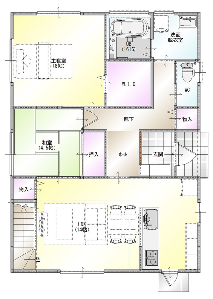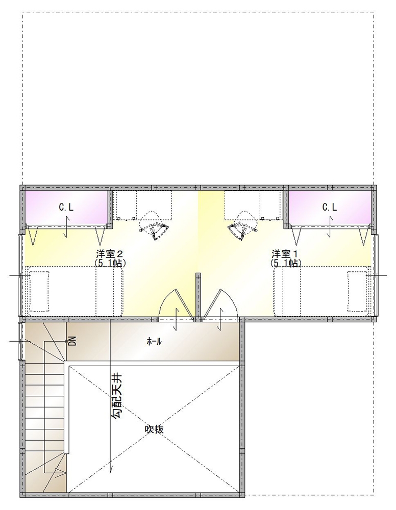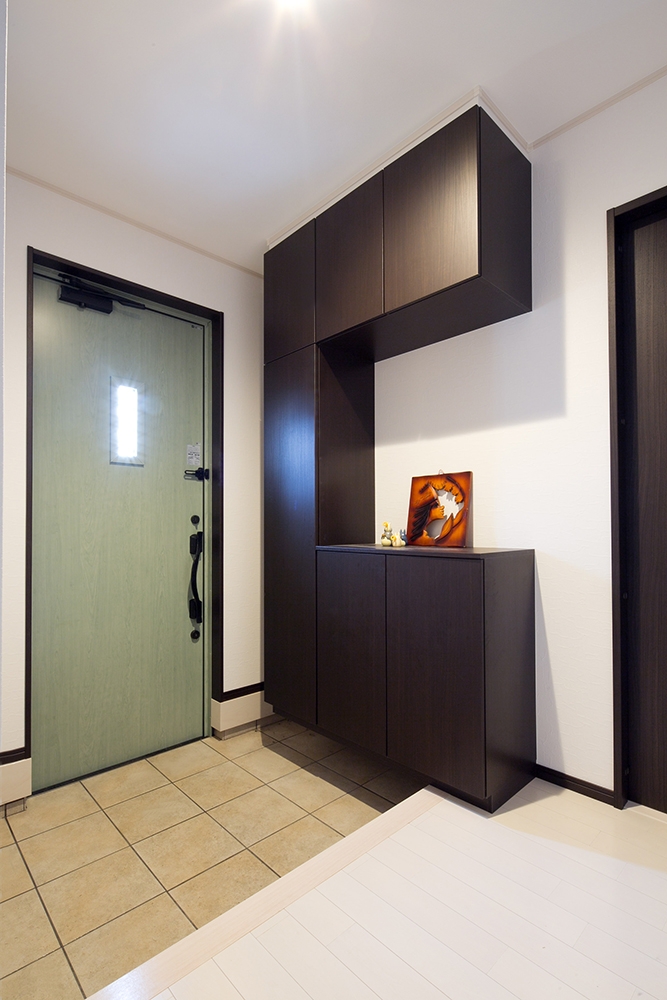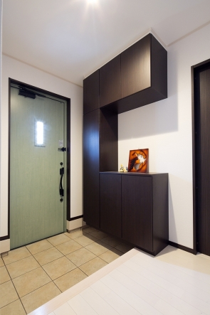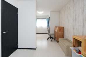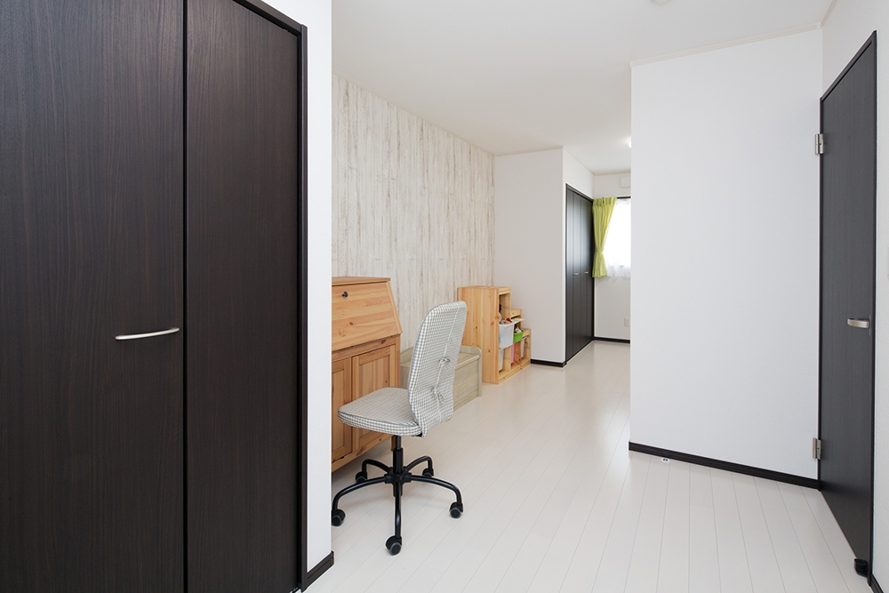 出入口ドアは2つとも残し、お子様たちが成長したら間仕切壁を造るだけで、各自が独立したお部屋をもてるようにしました。