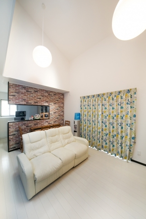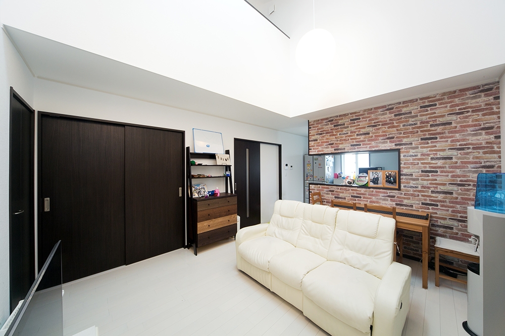 レンガ調のクロスが印象的なLDK。床をホワイト色にしているのでより広く感じられます。