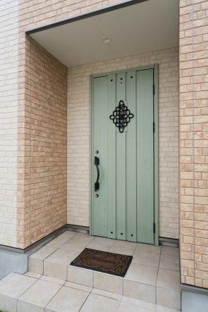 ミストグリーン色の玄関ドアが、淡い色の外観とマッチしています。