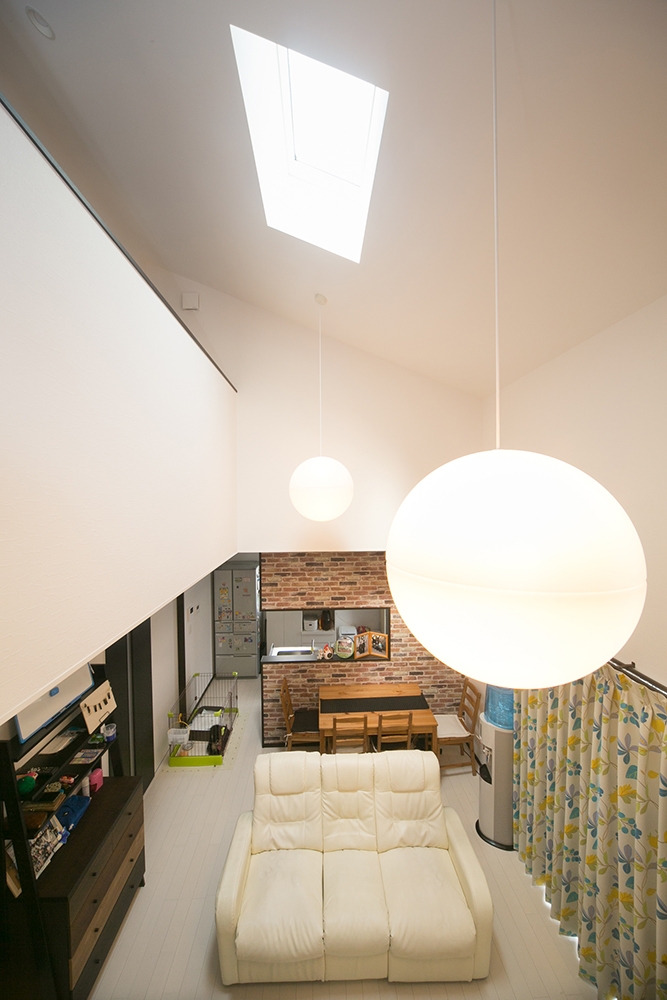 勾配天井には天窓を取り付けました。陽の光が降りそそぎ、リビングの明るさが増します。