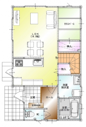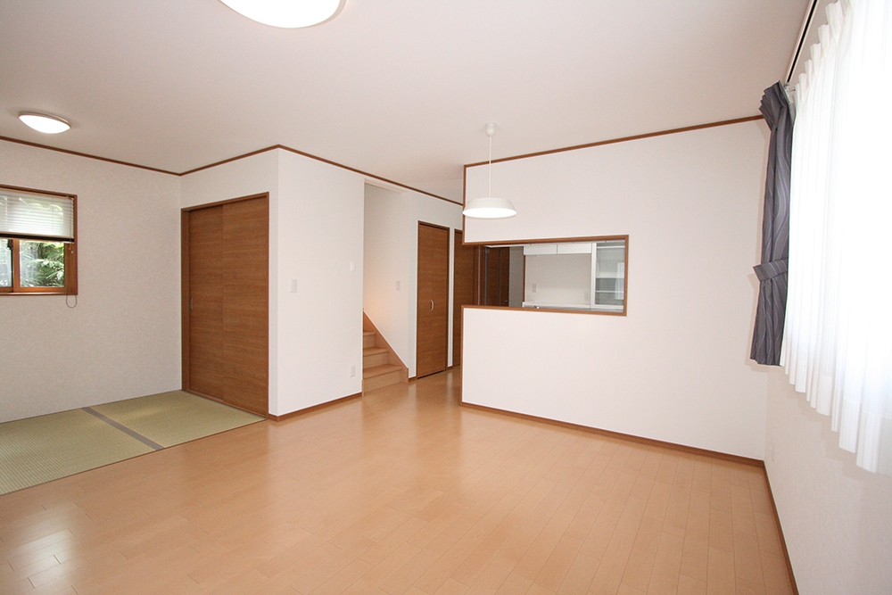 リビング階段と畳スペースが特徴的な明るいリビングです。