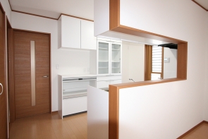 リビング側から見たキッチンスペース。背面収納も設置しました。これだけの収納があれば食器棚を置く必要なく広く使えます。