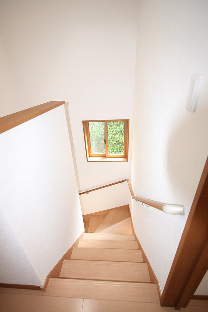 階段部分にも小さな窓を付けました。もちろん手すりも標準でついています。この階段を降りると、リビングに直接つながっています。