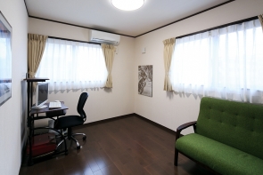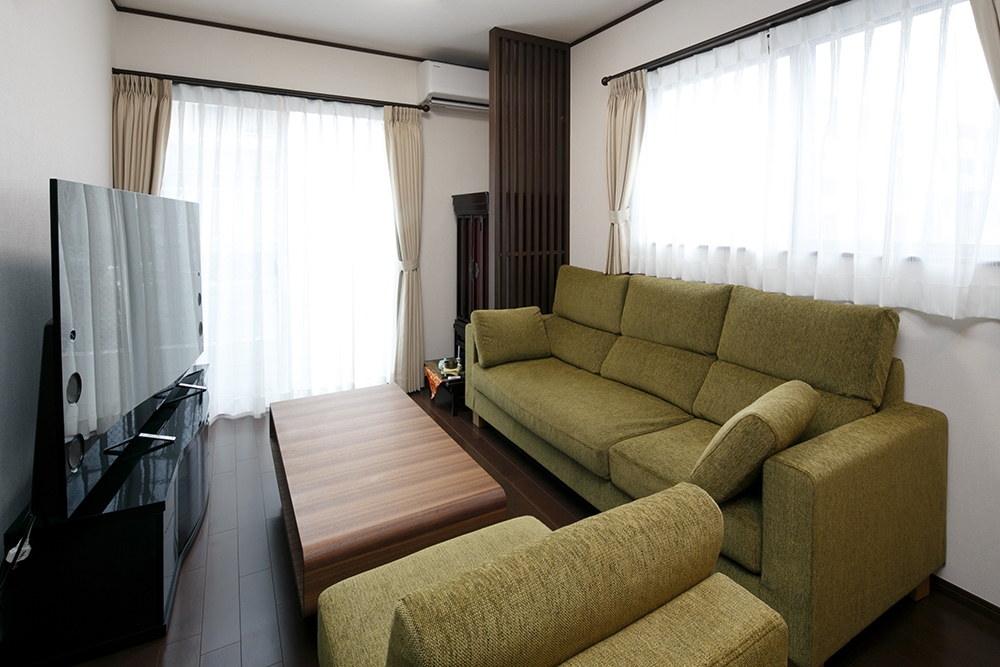 奥のコーナー付近にはお仏壇を置かれています。お部屋全体の雰囲気を損なわないよう格子の間仕切りを施工しました。