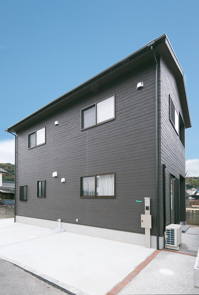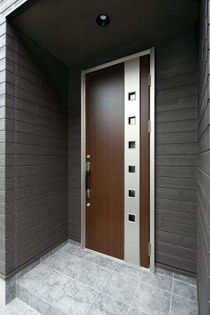 シンプルな黒の外観にマッチする玄関ドアを選びました。