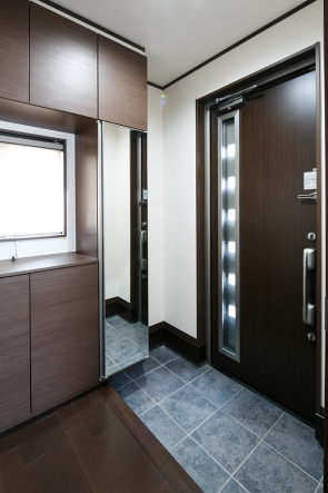 大容量の玄関収納です。扉はミラー付きを選びました。