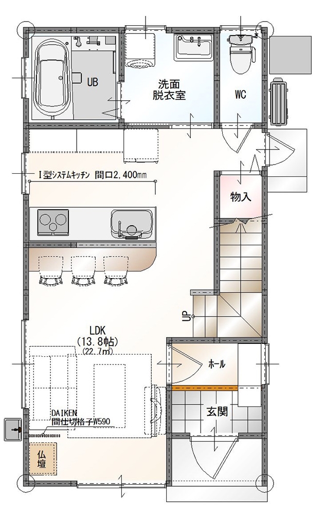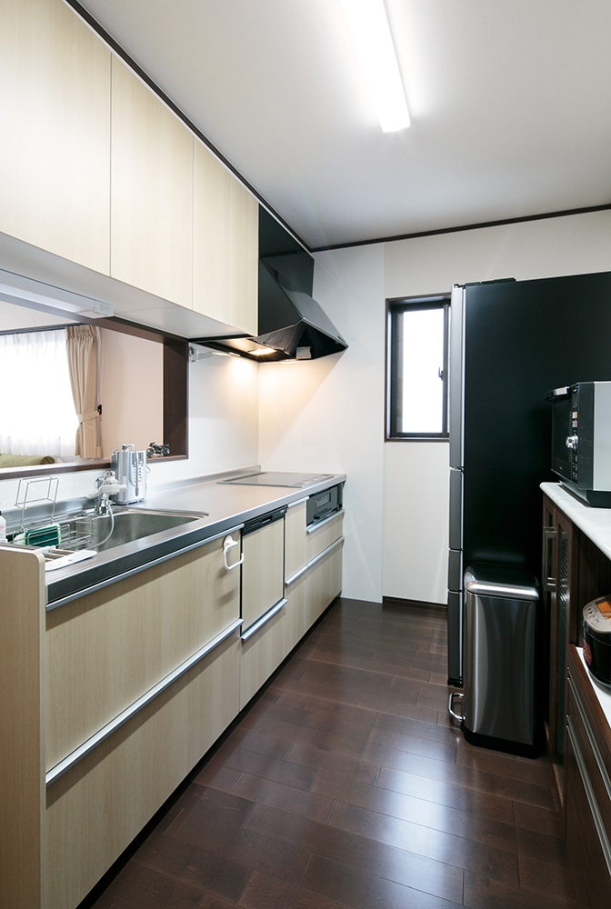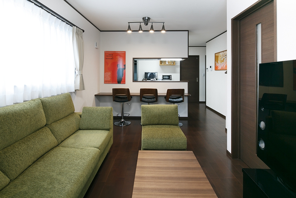 対面キッチンにはカウンターテーブルを造りました。ダイニングテーブルを置かず空間を広く使えます。