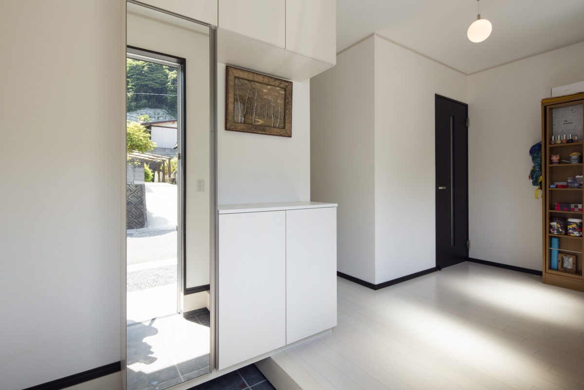 たっぷり玄関収納を設置しました。扉にミラーを付け、お出かけ前の身だしなみチェックも万全です。