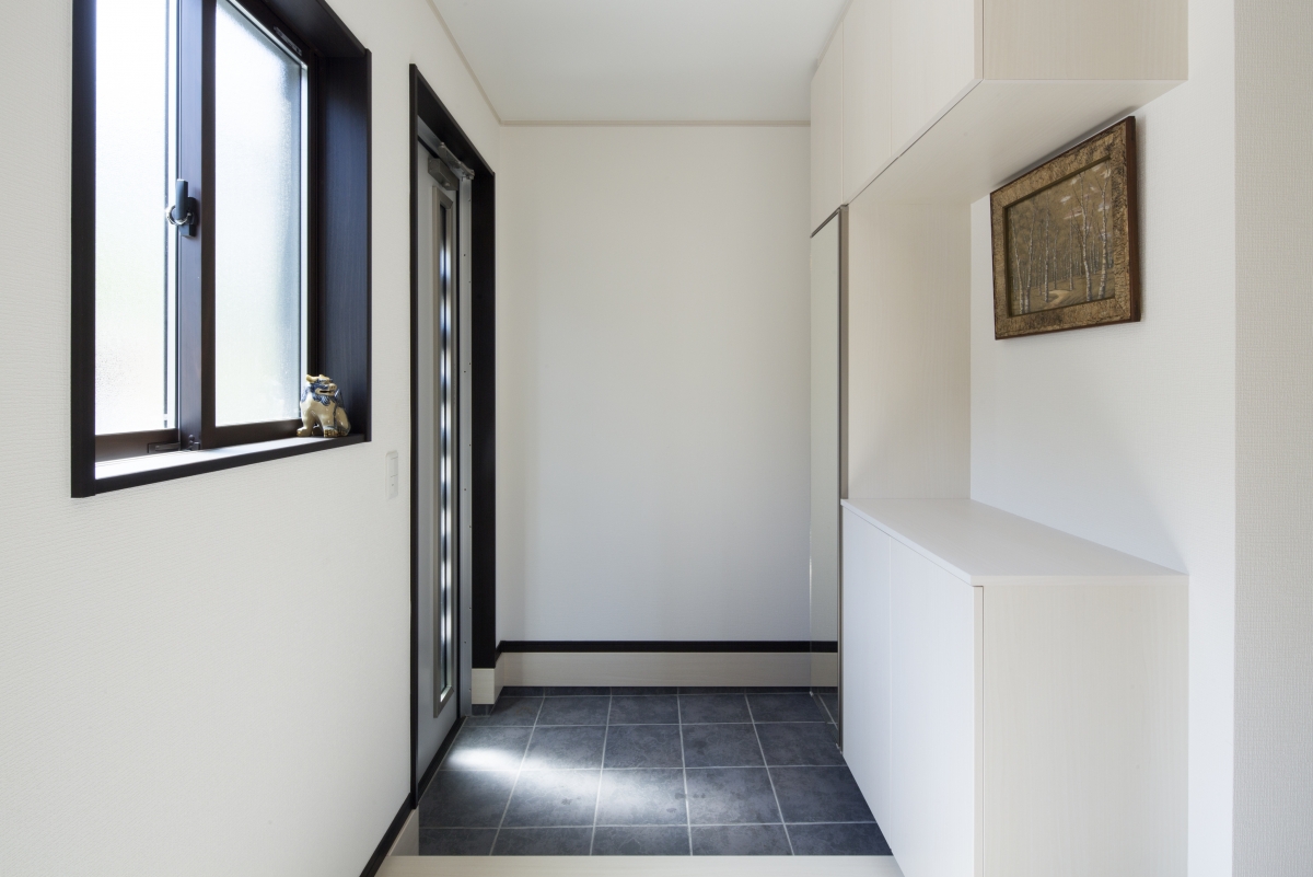 ホワイト調でまとめた玄関ホール。窓があるので、空間がより一層明るくなります。