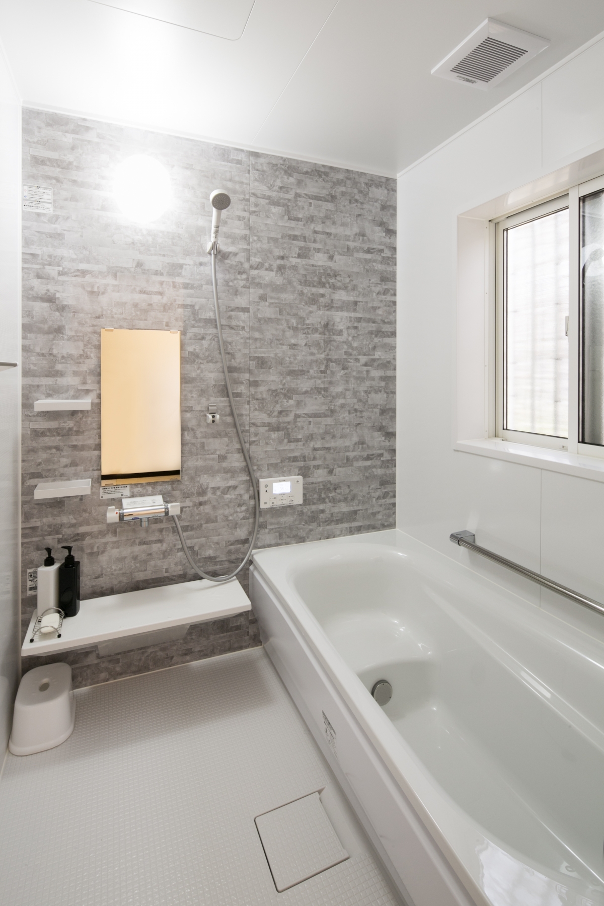 浴槽横には手すりを取り付け、ご高齢のお父様に配慮しました。ゆったり1坪サイズで動作もしやすく、安全性がアップしました。
