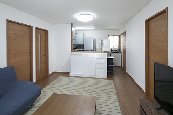 15帖のLDKです。個室へは必ずリビングと通らなければならない間取りです。