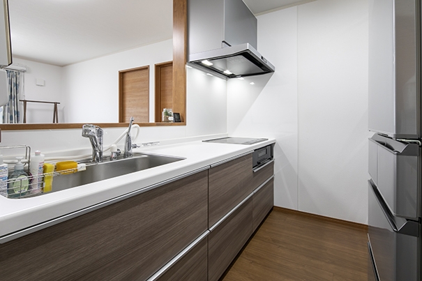 対面キッチンのリビング側に収納を設置し、無駄な空間ができないように設計しました。