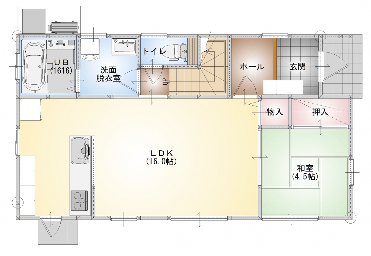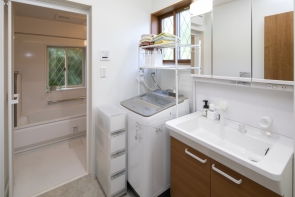 洗濯機を置いてもゆとりある広さの洗面脱衣室は1坪サイズです。