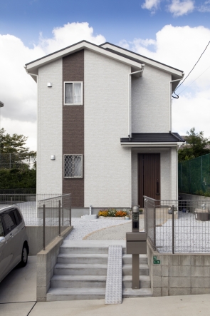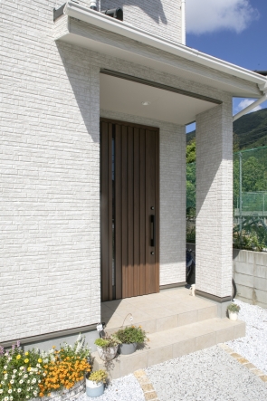 木のぬくもりを感じるような玄関ドア。外壁の色とも大変マッチしています。