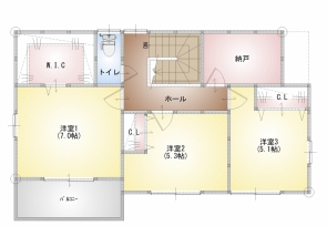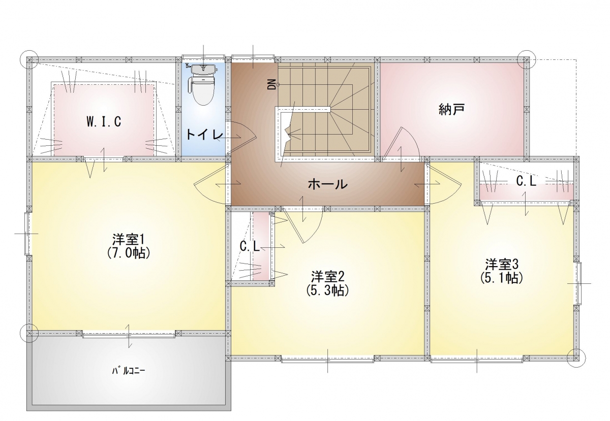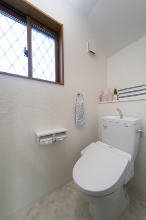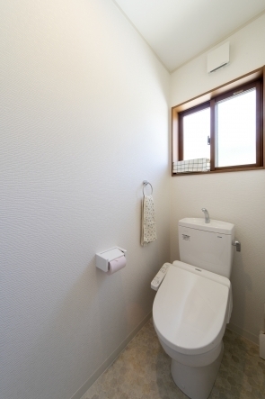 2階にトイレがあると、やはり便利です。清掃性を第一に、シンプルなものを選びました。