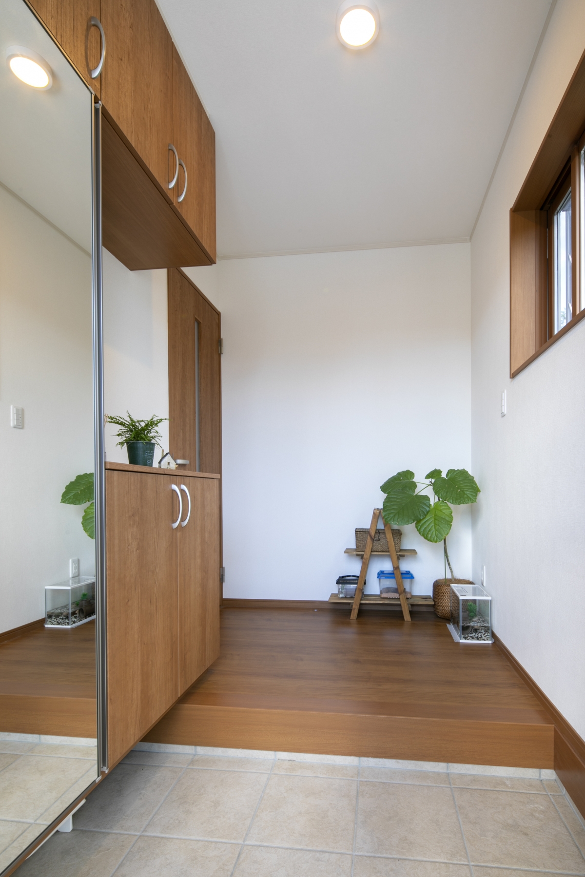 お出かけ前に身だしなみのチェックを行えるよう玄関収納はミラー付を選びました。
