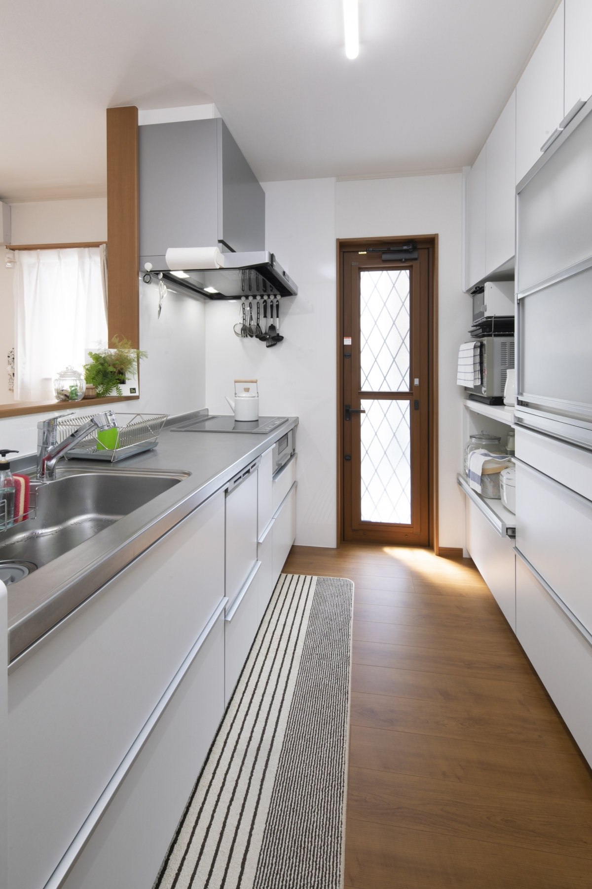 背面収納も併せて施工しました。勝手口は通風タイプで、においや熱がこもりません。