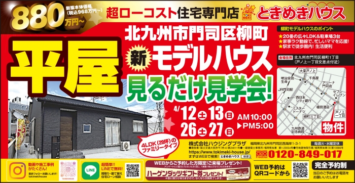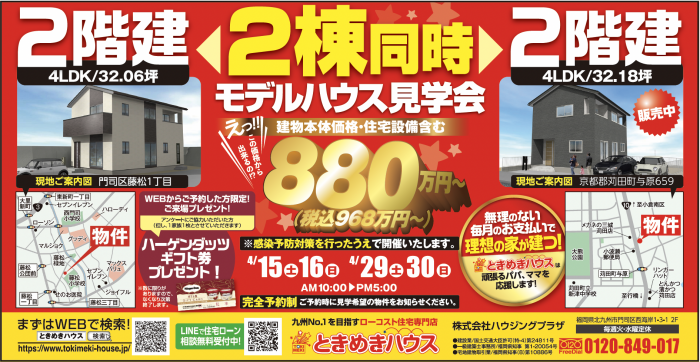 【完全予約制】4月12日(土)~13日(日)、26日(土)~27日(日)にモデルハウス見学会を開催!