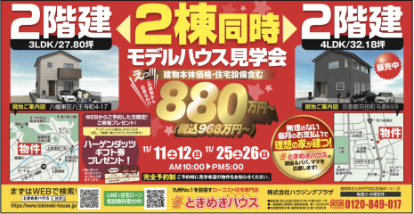八幡東区八王寺町(2階建て)と京都郡苅田町与原(2階建て)の2棟でモデルハウス見学会を開催します!