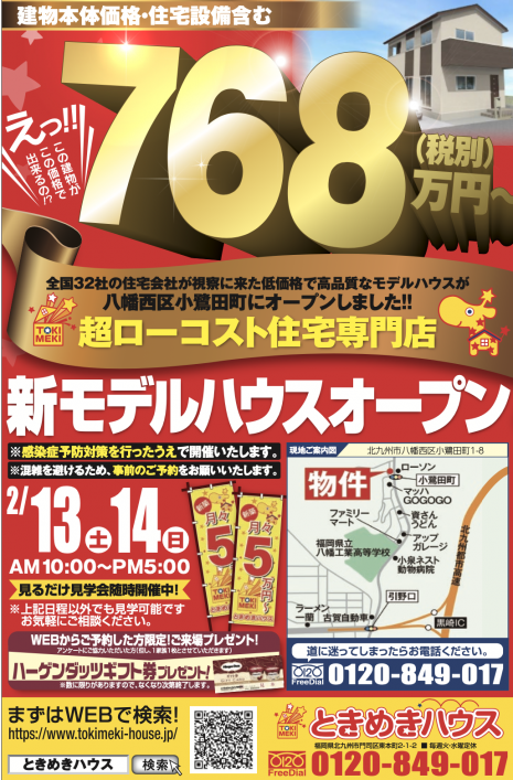 八幡西区小鷺田町でローコスト住宅の「モデルハウス見るだけ見学会」を開催します!