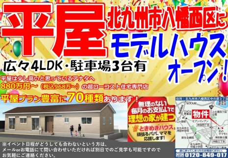 八幡西区中の原でローコスト住宅の「〈平屋〉モデルハウス見るだけ見学会」を開催します!