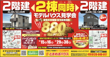 門司区藤松(2階建て)と京都郡苅田町与原(2階建て)の2棟でモデルハウス見学会を開催します!