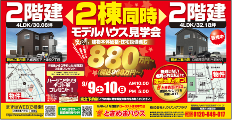 八幡西区下上津役(2階建て)と京都郡苅田町与原(2階建て)の2棟でモデルハウス見学会を開催します!