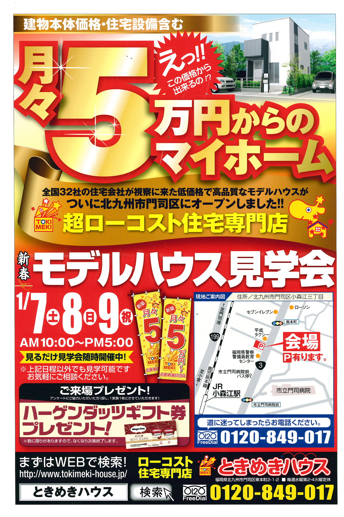 北九州市門司区小森江でローコスト住宅のモデルハウス見るだけ見学会を開催。 ホームページからご予約された方にはお得な特典もあります。 お気軽にお申し込みください。