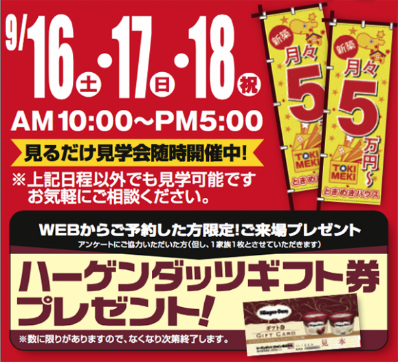 9月16日(土)〜18日(祝)にモデルハウス見るだけ見学会を開催!