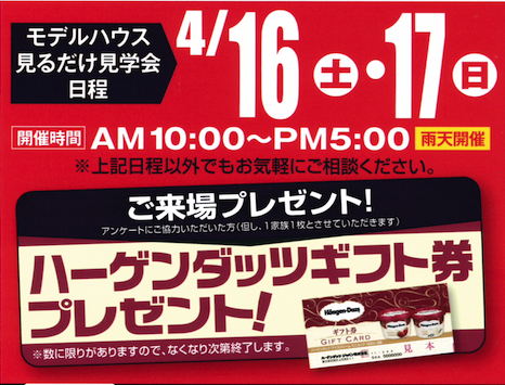 4月16日(土)17日(日)にモデルハウス見るだけ見学会を開催!