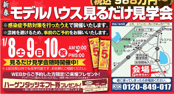 【完全予約制】1月20日(土)~21日(日)、27日(土)~28日(日)に2棟同時モデルハウス見学会を開催!