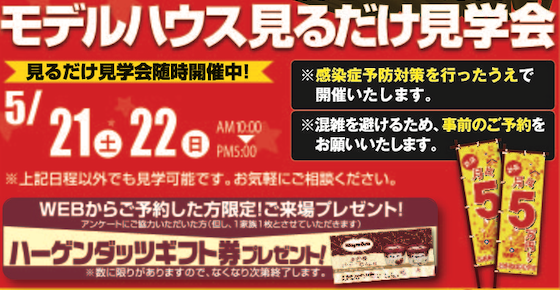 【完全予約制】5月18日(土)~19日(日)、25日(土)~26日(日)にモデルハウス見学会を開催!