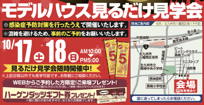 八幡西区南八千代町に完成したローコスト住宅のモデルハウスの「見るだけ見学会」を開催。
