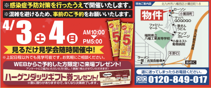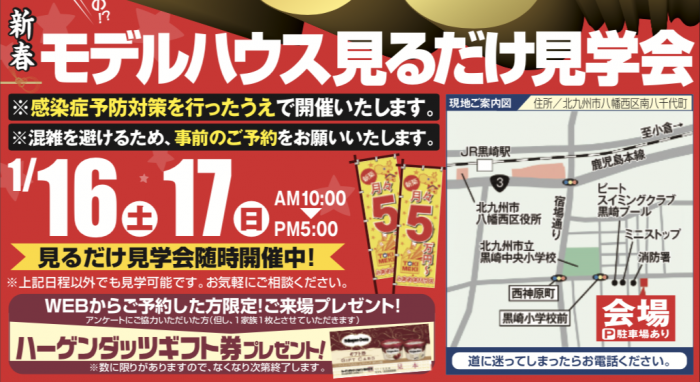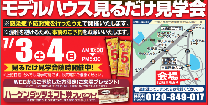 小倉南区中吉田に完成したローコスト住宅のモデルハウスの「見るだけ見学会」を開催。