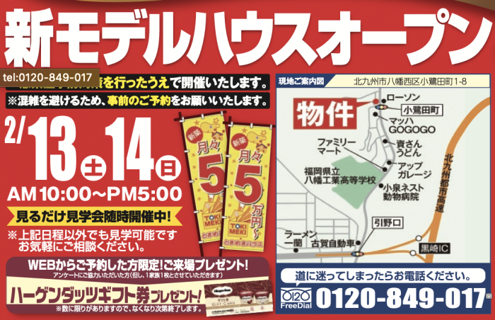 八幡西区小鷺田町に完成したローコスト住宅のモデルハウスの「見るだけ見学会」を開催。