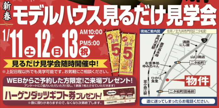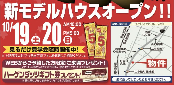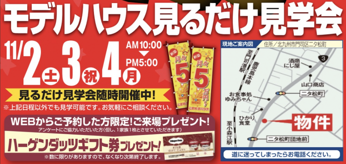 門司区二タ松町に完成したローコスト住宅のモデルハウスの「見るだけ見学会」を開催。