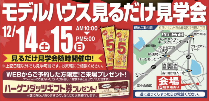 小倉南区中吉田に完成したローコスト住宅のモデルハウスの「見るだけ見学会」を開催。