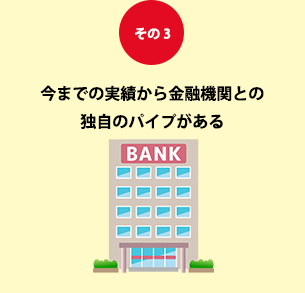 そうして多くの実績を残し、その実績を金融機関にも評価いただくことによって、独自のパイプをつくってきました。