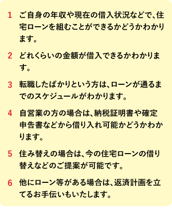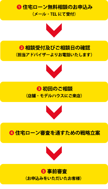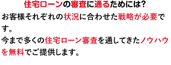 お客様の個人信用情報をきちんと分析したうえで、過去審査に落ちた場合はその原因をはっきりさせ、戦略的に住宅ローンの審査を通す流れをご提案しています。