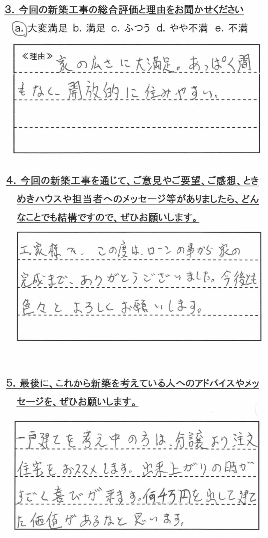 総合評価:大変満足 家の広さに大満足。あっぱく間もなく、開放的に住みやすい。
